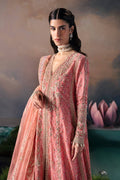 Wrap yourself in the elegance of a printed pink long-length gown, where intricate handwork creates a stunning tapestry in shades of white and pink. The luxurious gown is adorned with shimmering cutdana, sittara, and pearls. Paired with sophisticated flared sharara pants and an organza dupatta featuring embroidered borders and delicate motif sprays, this ensemble invites you to exude timeless elegance with every step.