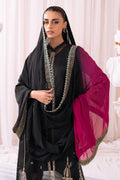 Fareen is a timeless black organza gown featuring a ban neckline with a centrally embellished front adorned with motifs, embroidery, and delicate spread work, finished with a contrasting embellished border. The sleeves are beautifully detailed with embroidery and adda work, finished with lace for a graceful touch. A vibrant contrasting tie & dye organza dupatta in hot pink hues adds a pop of color, highlighted with a four-sided embroidered border, lace, and facing. The ensemble is completed with a raw silk inner and plain straight pants, making it a sophisticated choice for elegant occasions.