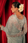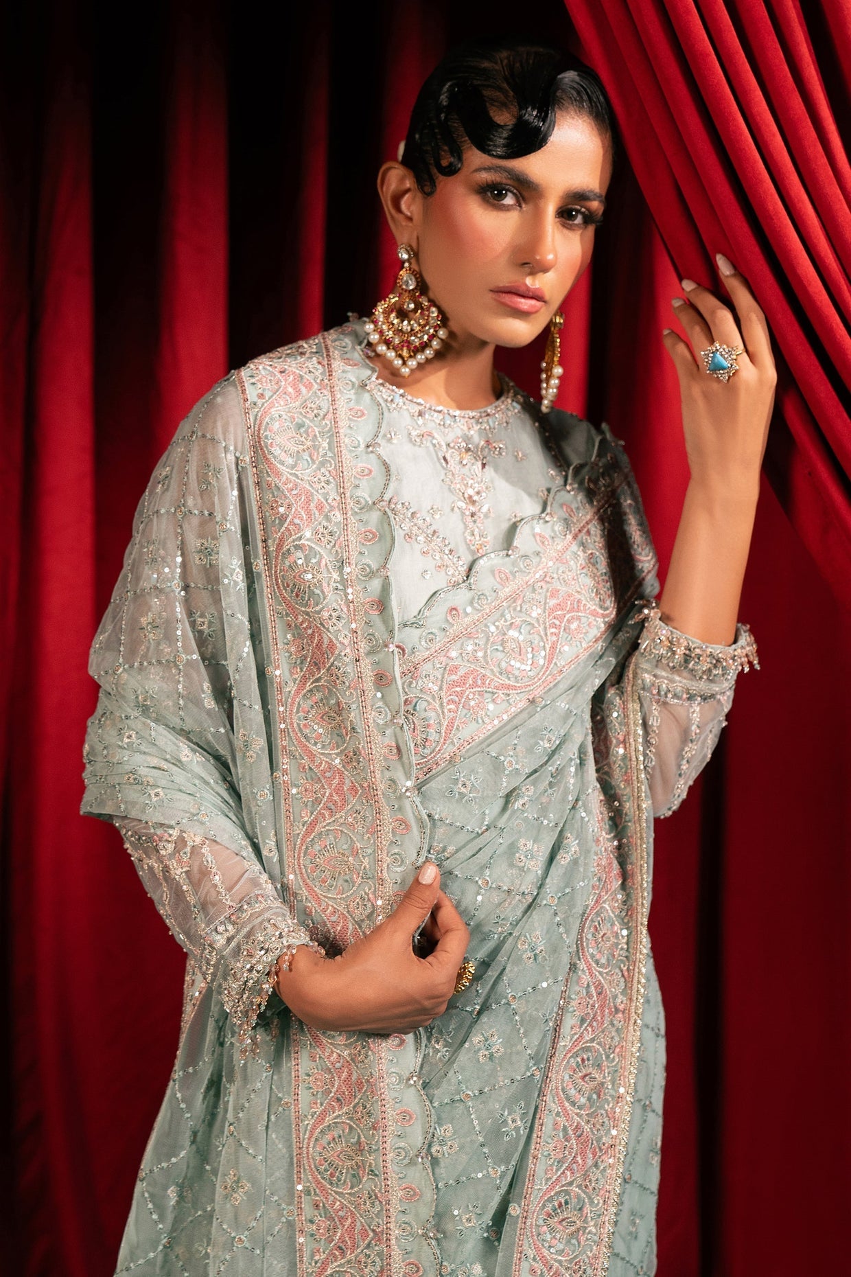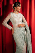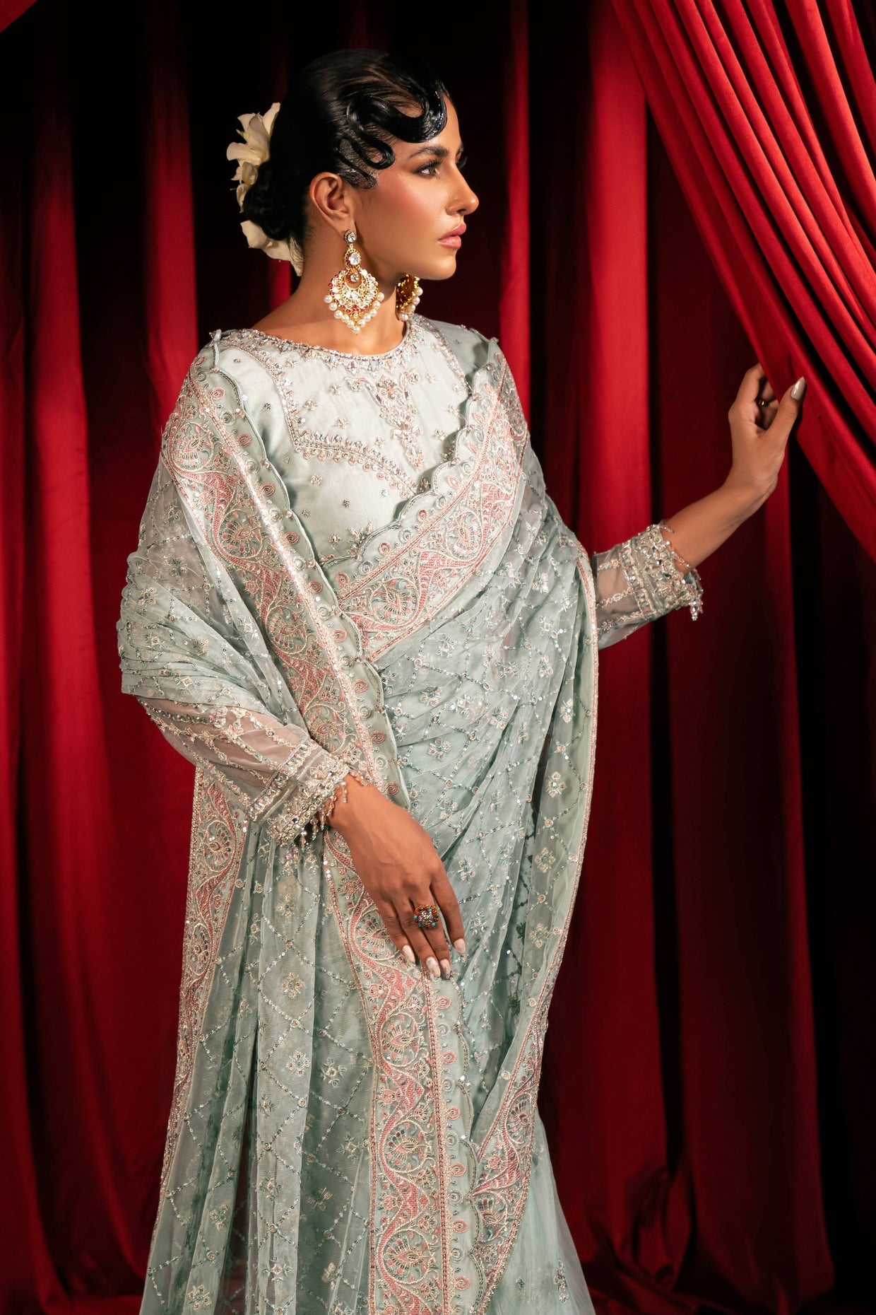 This delicate powder blue saree has hand adda embellishments on the front & back of the near to neck, neckline along with dangling crystal hangings on the sleeves. The front & back of the blouse is adorned with multi-head embroidery along with handmade back tassels. The exquisite saree is bejeweled with embroidery & sequin spread & a lustrous jaal. The pink contrasted scalloped borders of the saree are adorned with base filling alongside embroidery & sequin work. Hanna comes with a PK raw silk petticoat.