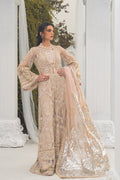 A delicate and flowy peach net flared embroidered gown with pearl accents on the front and back. Paired with a beautiful foil dupatta.