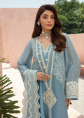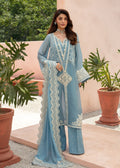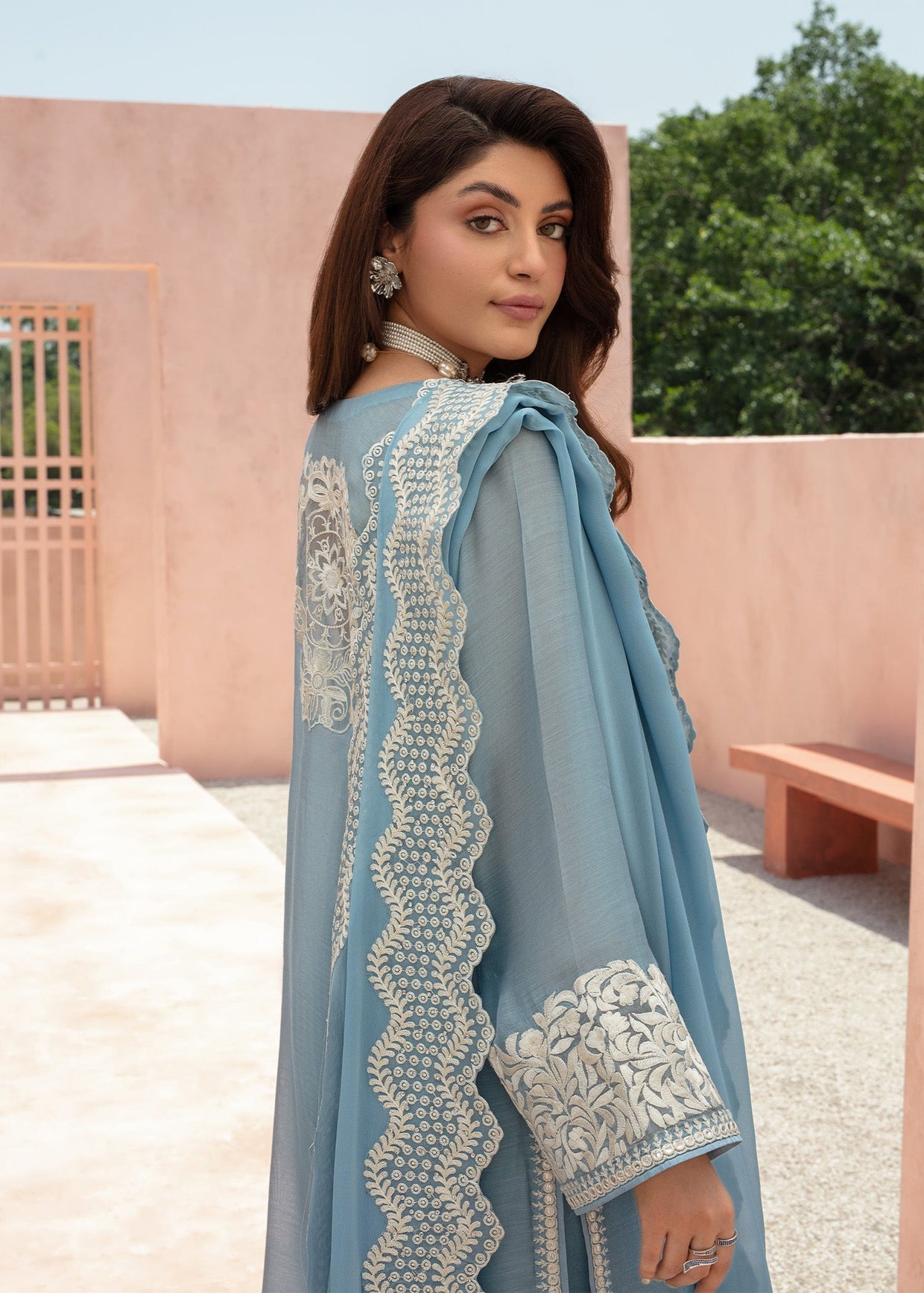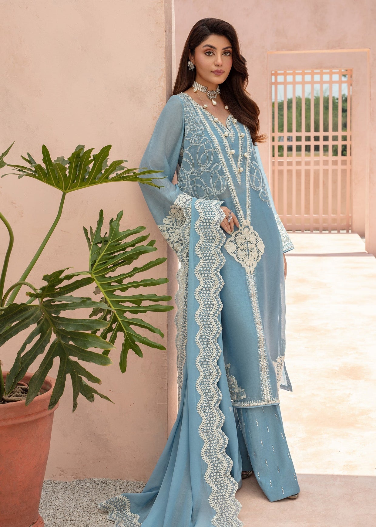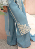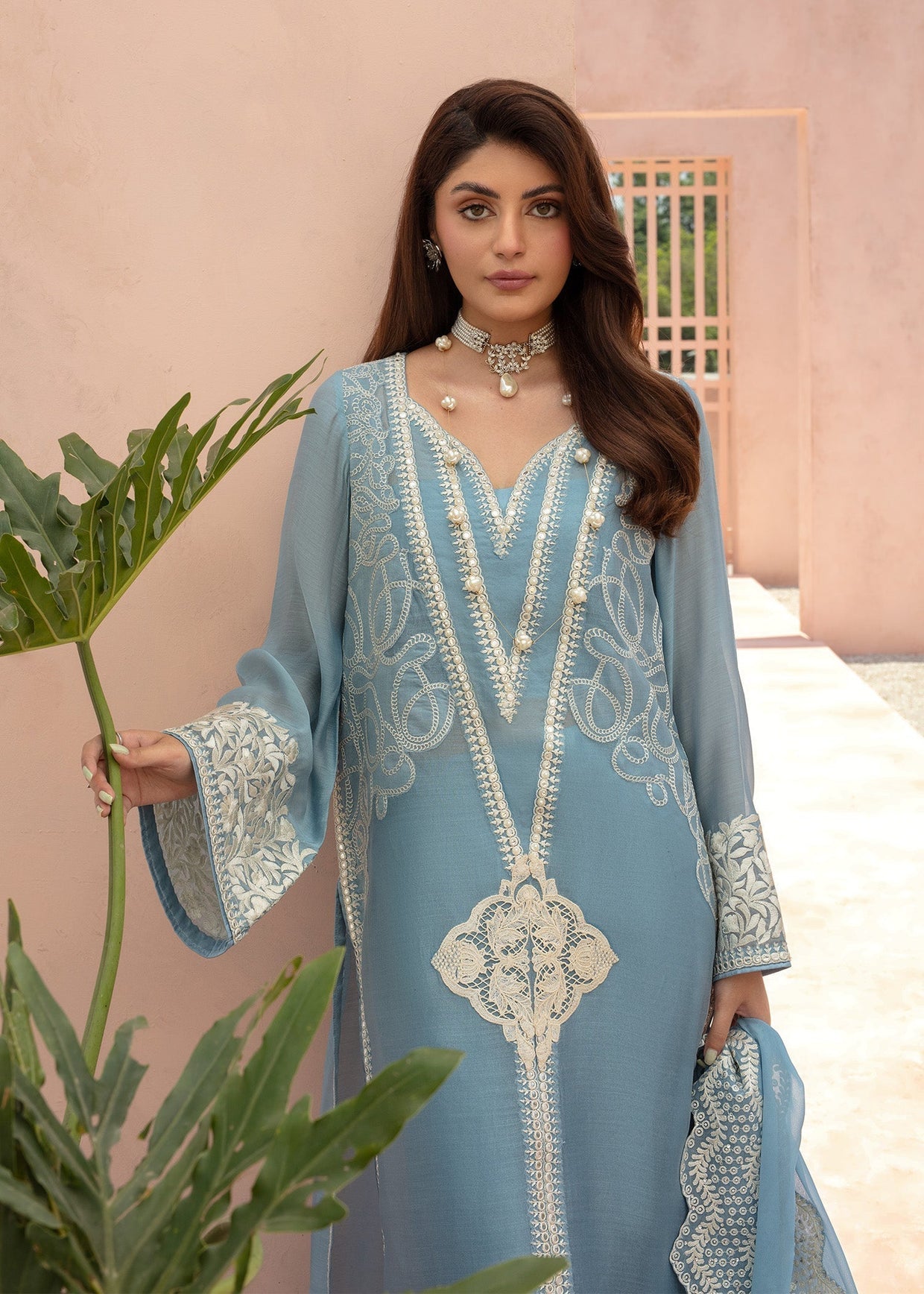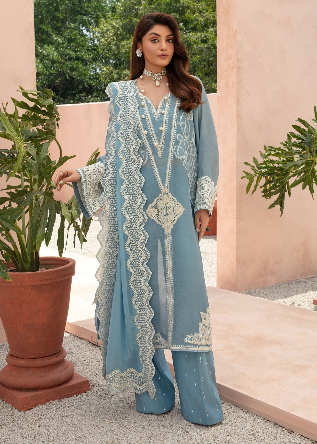 A three-piece ensemble featuring delicate white embroidery on shirt and dupatta and intricately embellished trousers, adding a touch of elegance, making it perfect for any occasion.