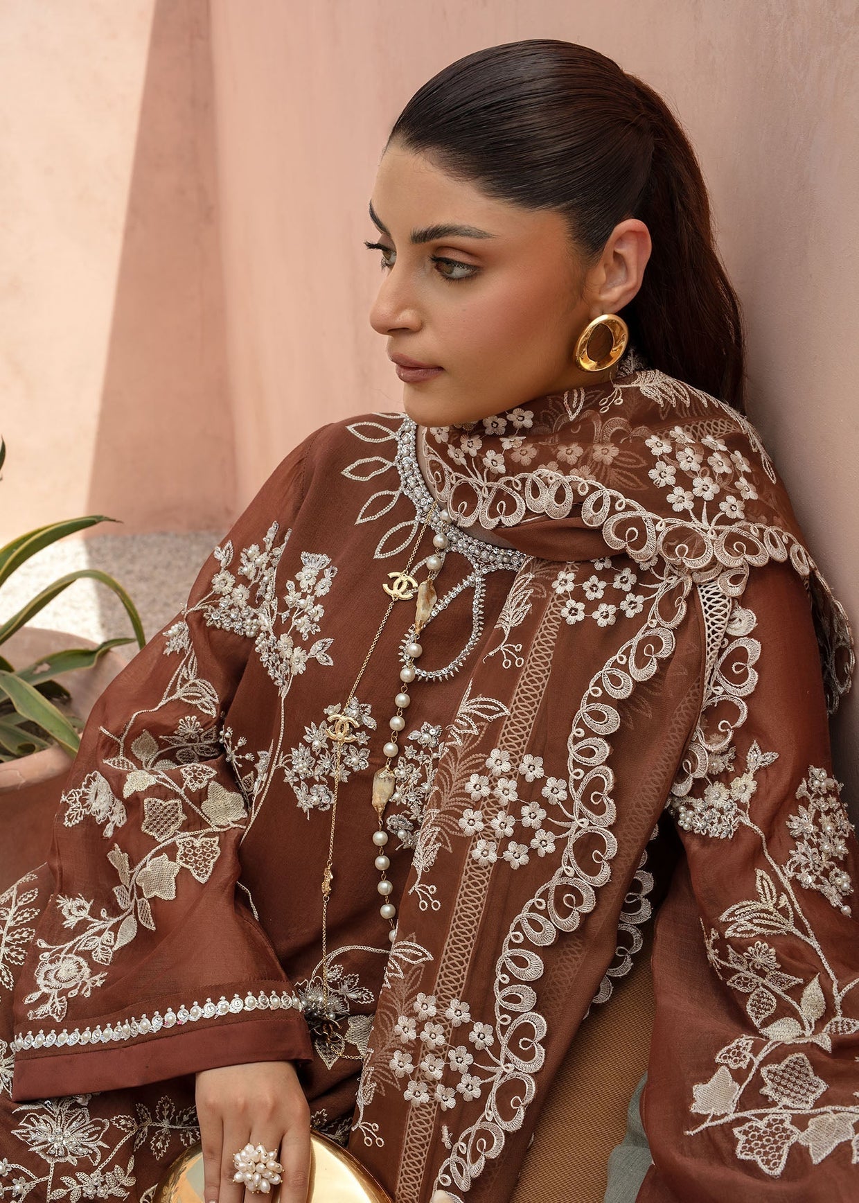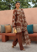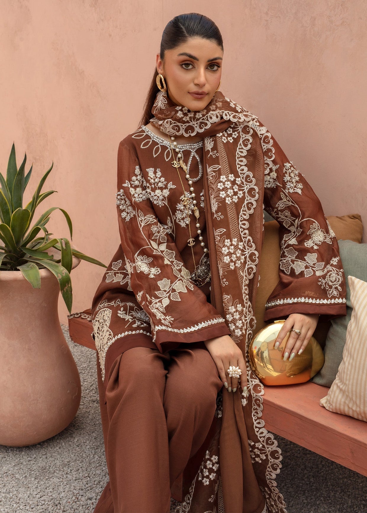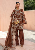 A stunning three-piece stitched outfit which combines a rich caramel base with intricate white embroidery on shirt and dupatta to make an elegant and subtle statement making it a perfect addition to your wardrobe.