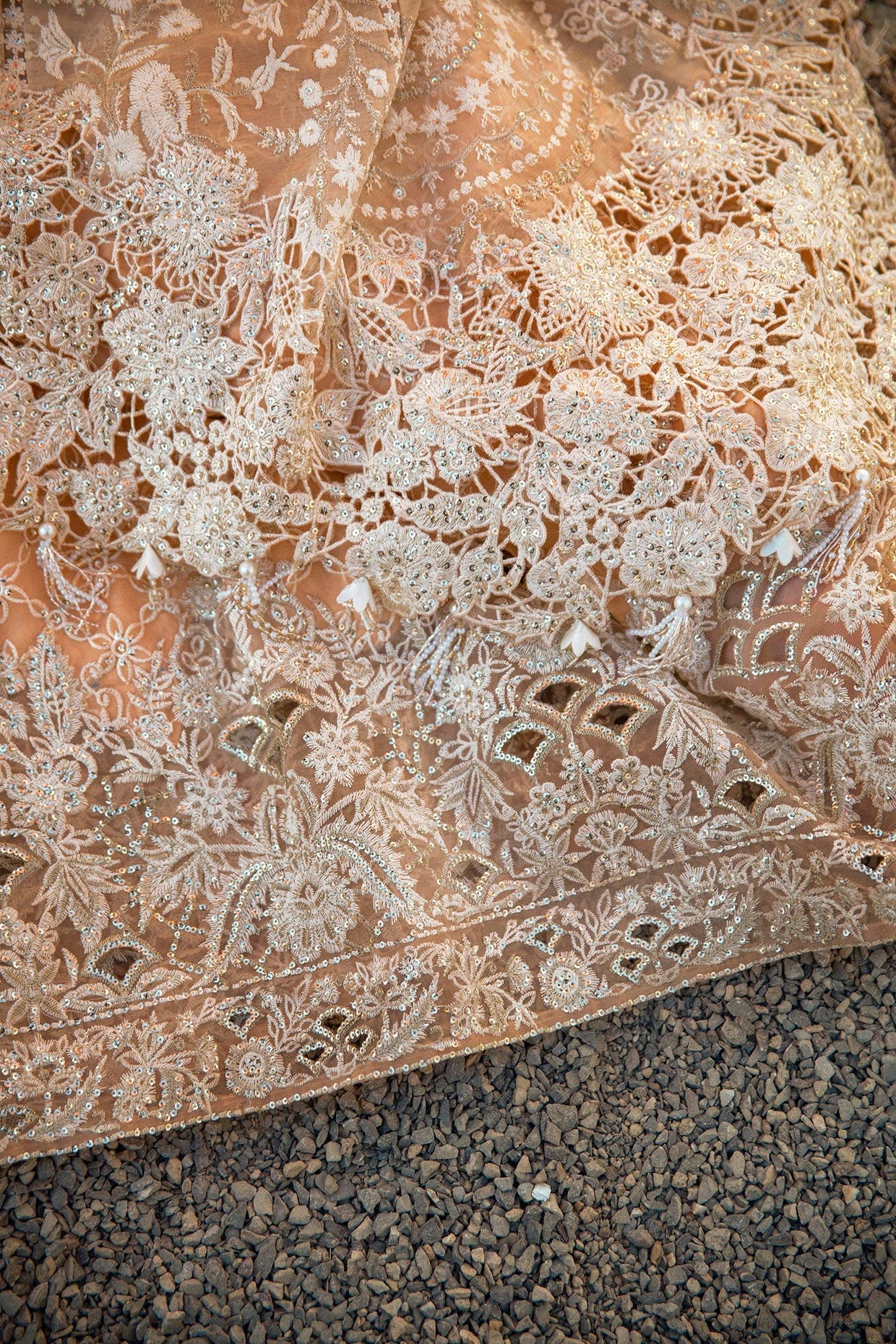 This stunning 3-piece peach ensemble embodies elegance with its luxurious masori tissue and organza craftsmanship. The shirt features hand-embellished front body panels paired with intricately embroidered back and multiple embroidered tissue panels, enhanced by embellished and embroidered organza laces and cutwork sleeves. The daman border further elevates the richness of the design. A beautifully embroidered net dupatta with pallu detailing completes the sophisticated top layer. The highlight of the outfit is the embroidered jaal organza lehnga with an ornate border, layered over a peach silk lining for added structure and volume. Perfectly designed for weddings, formal gatherings, or festive celebrations, this outfit radiates timeless charm and refined artistry.