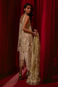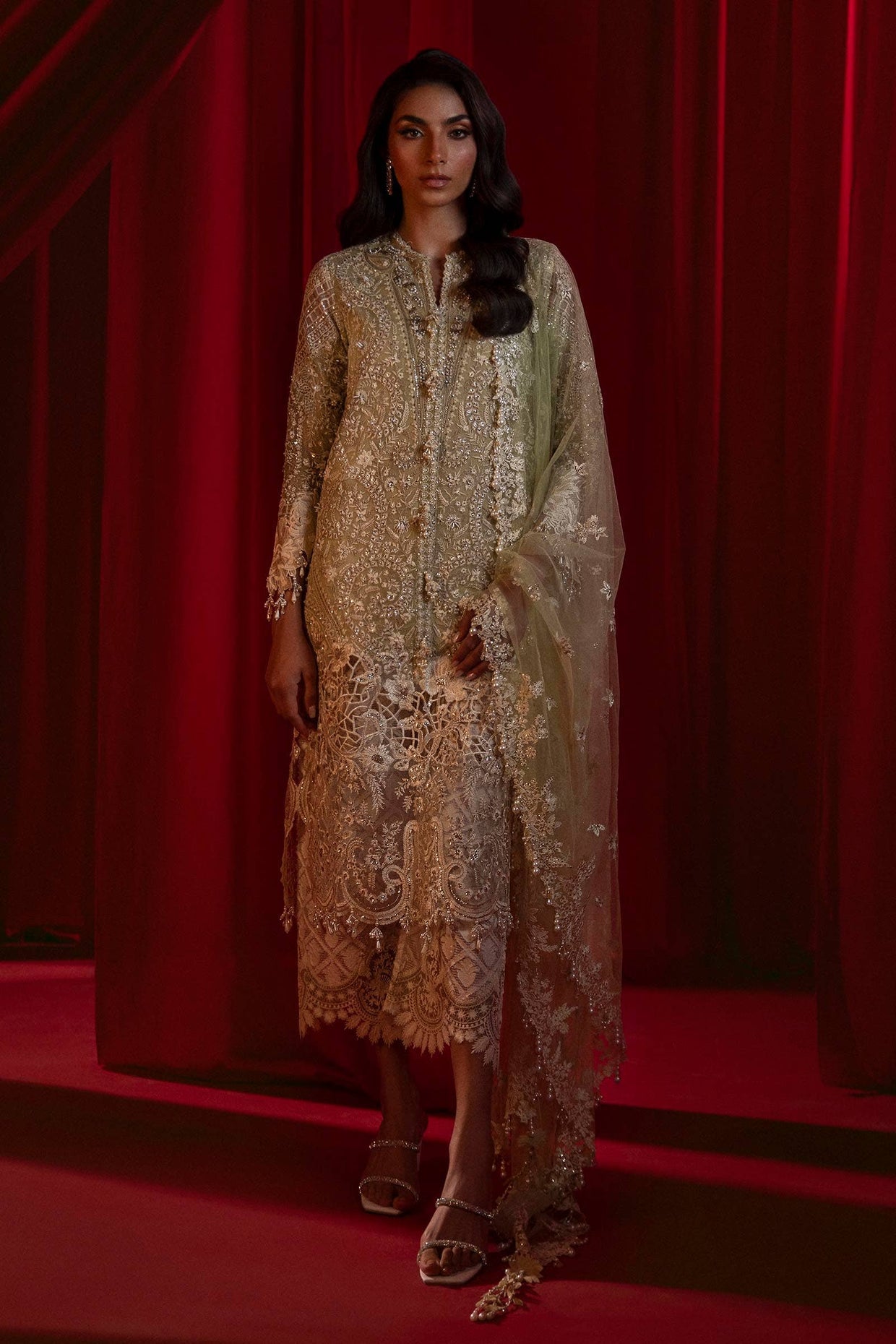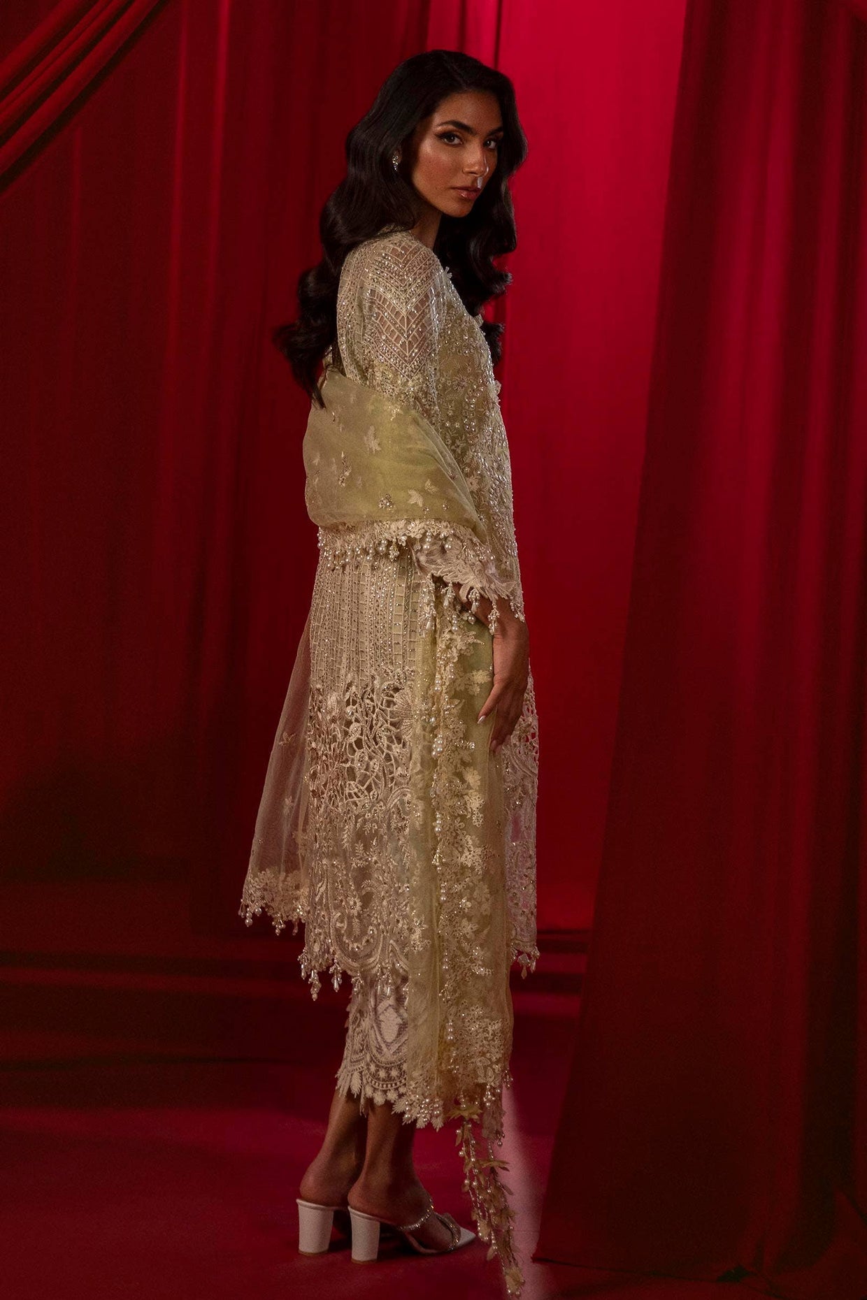 This graceful 3-piece outfit comes in a refreshing light green shade, featuring embellished tissue front panels and sleeves paired with embroidered net back and sleeve jaal for a touch of refinement. Cutwork and embroidered borders on organza and net enhance the overall detailing, while a soft beige silk lining adds structure to the shirt. The dupatta, crafted in soft green net with embroidered pallu panels, creates a beautifully flowing silhouette. Completing the look, the cream organza jacquard trouser is elevated with embroidered borders and a cream silk lining, making this ensemble a perfect choice for formal gatherings and festive occasions.