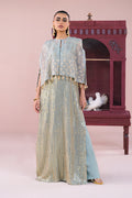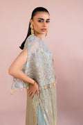 Mint sequinned long shirt paired with flared pants and embroidered organza cape.