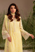 Product description: Fabric: Chiffon, raw silk and cotton silk 3pc Pale yellow chickenkari embroidered shirt in shades of ivory, enhanced with pearl detail on neck and pastel coloured embroidered borders. Paired...