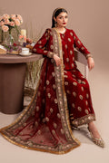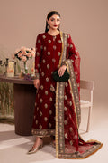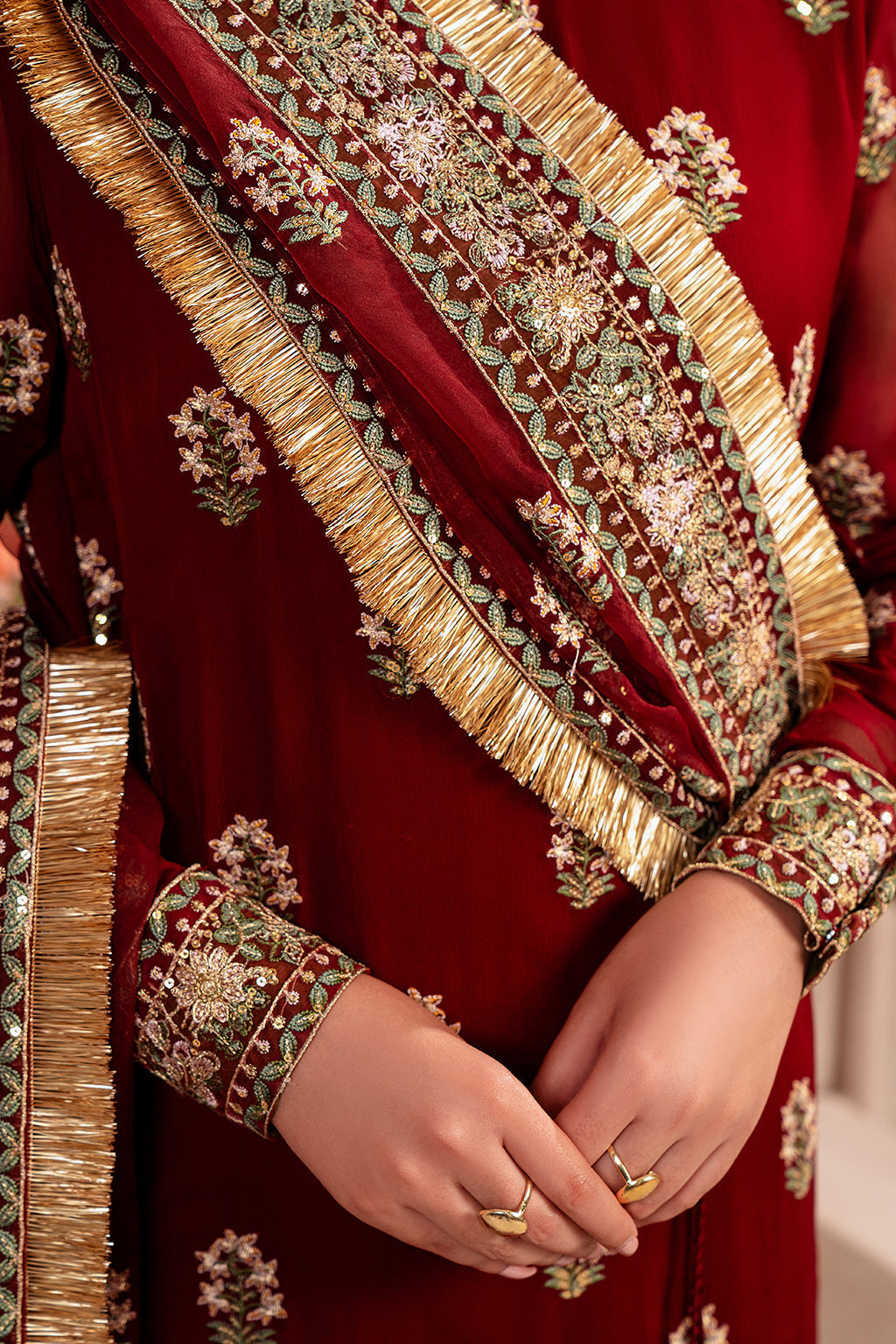 Product description: Fabric: Chiffon, organza, raw silk and cotton silk 3pc Deep maroon delicately embroidered motifs all over chiffon shirt and organza dupatta finished off with embroidered borders. Paired with raw-silk...