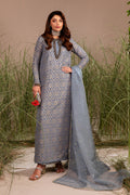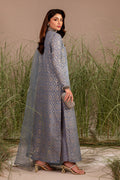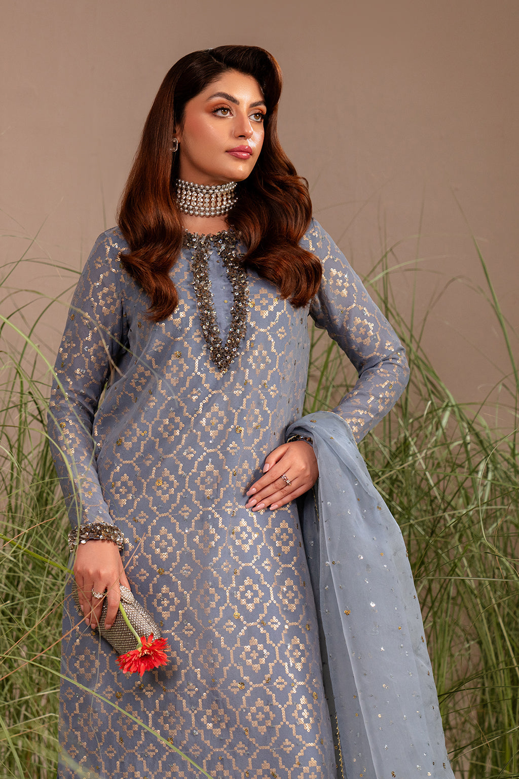 Product description: Fabric: Organza, chiffon and raw-silk 3pc Slate grey organza shirt with sequinned pattern lining, enhanced with chunky hand worked neckline and sleeve paired with raw-silk culottes