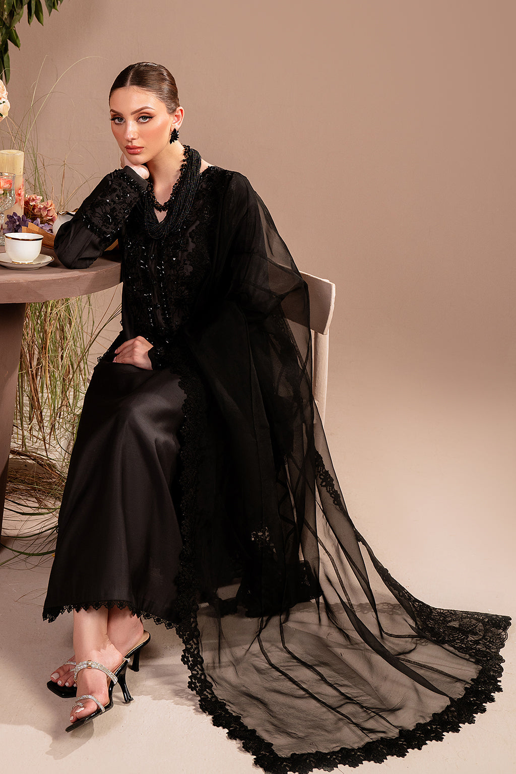 Product description: Fabric: Resham Silk & Chiffon 3pc suit This 3-piece suit is made of black silk. The whole outfit is black, with intricate embellished embroidery on the neckline. The shirt has straight...