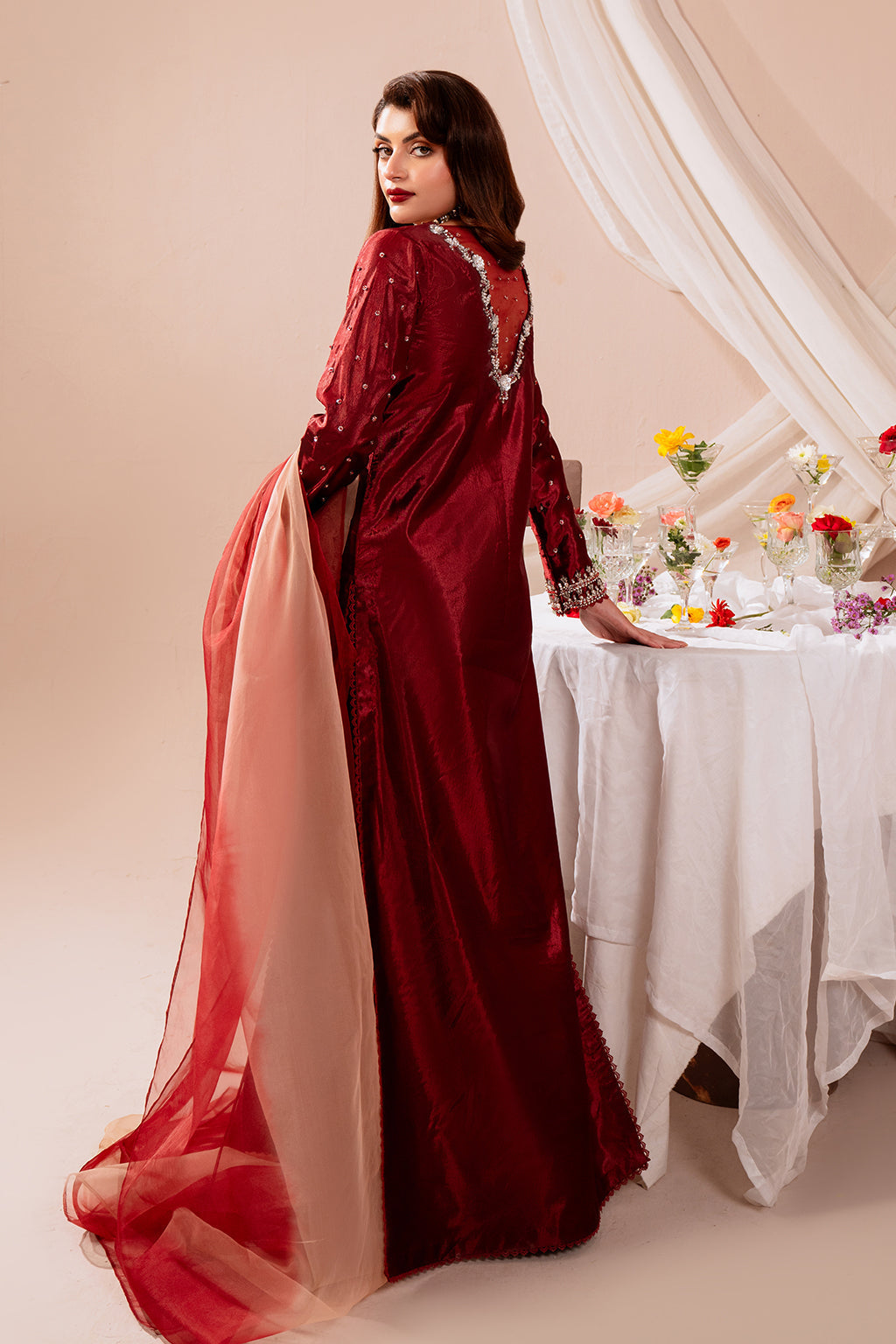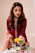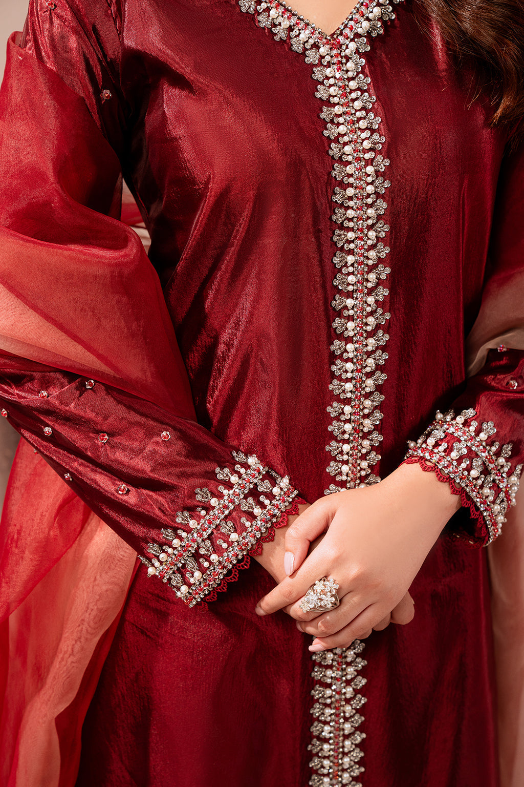 Product description: Fabric: Tafetta silk and organza 3pcD-Maroon color long shirt, delicately hand embellished on front,back and sleeves, paired with a wide legged plazo and tie-dye dupatta.